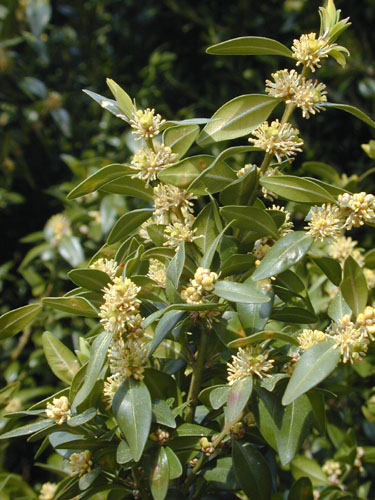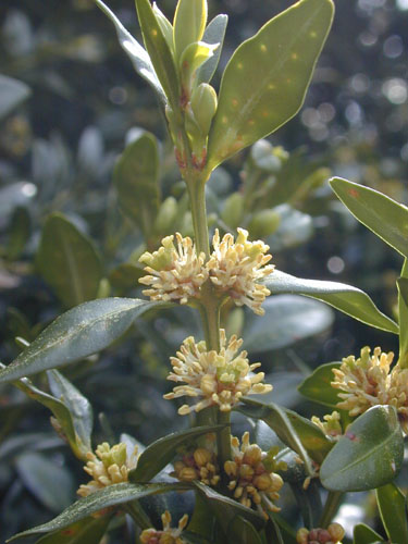 Voucher: Kostadinov 185, (URV) Brief description: A monoecious shrub to a small tree. Leaves are smallish, oval to oblong-lanceolate, often curved, leathery and shiny above, pale beneath, simple, opposite, entire. The lower surface of the leaf is conspicuously rusty with villous tomentum. Flowers are pale green, staminate ones axillary, pistillate ones - terminal. Fruits are ovoid dehiscent caps. Campus data: Frequently cultivated everywhere on campus. Other images: |