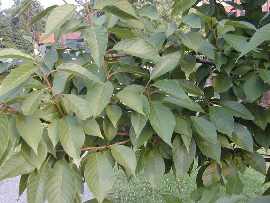 Voucher: Kostadinov 020, 207, (URV) Brief description: A small to medium-sized tree; the bark has characteristic horizontal lenticels. Leaves are large, ovate to narrow-ovate, simple, alternate, entire, pinnately veined, glabrous, margins acutely serrate-toothed. The distal end of the petiole may have 2-4 small glands. Flowers are perfect, purplish-pink, double, large, showy and dense. Fruits are a 1-seeded, black drupe with fleshy exocarp and hard endocarp (stone). Campus data: Frequently cultivated on campus, especially around Westhampton Lake.